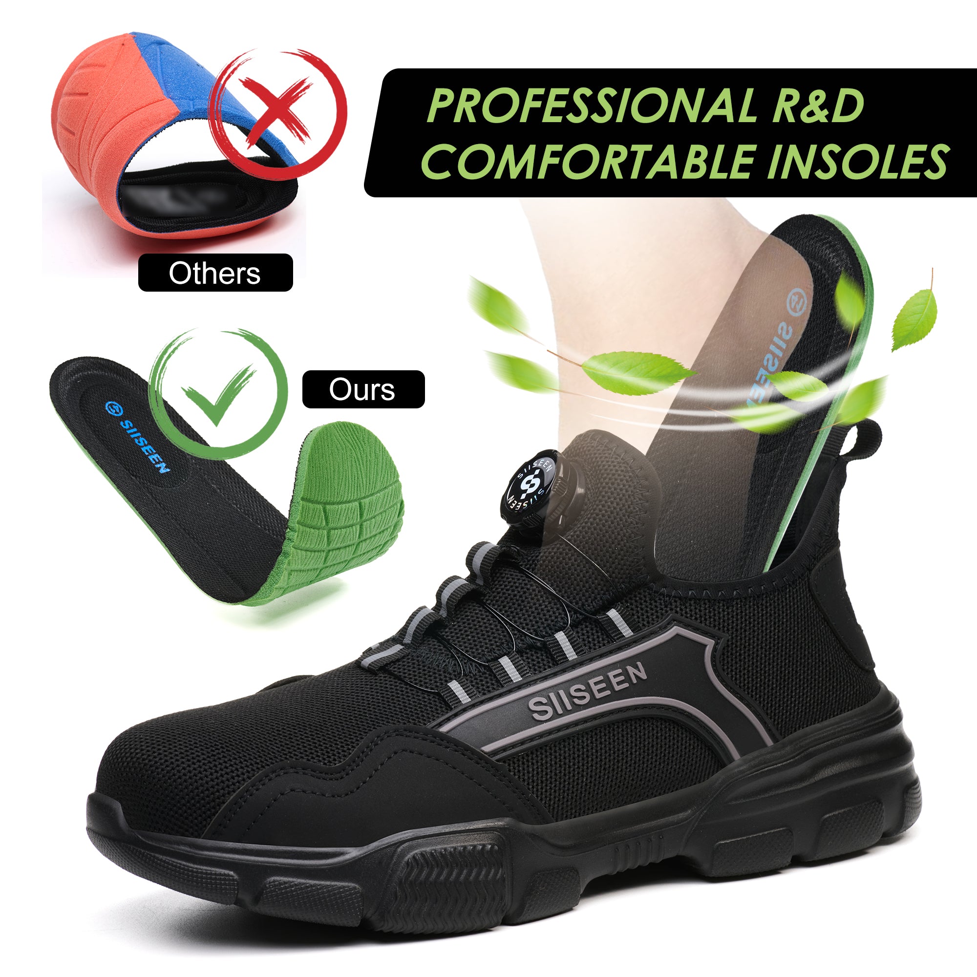 Lightweight Kevlar fiber prevents sharp objects like nails, glass, or metal scraps from piercing through the sole.